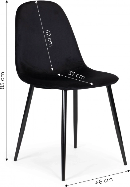 Setul stilat de patru scaune impresionează prin design modern, tapițerie din catifea și picioare metalice pentru durabilitate. Oferă un confort ridicat la ședere datorită spumei de calitate și spătarului ergonomic. Capacele de protecție protejează pardoseala, iar finisajul universal negru se potrivește în dining, living sau birou.