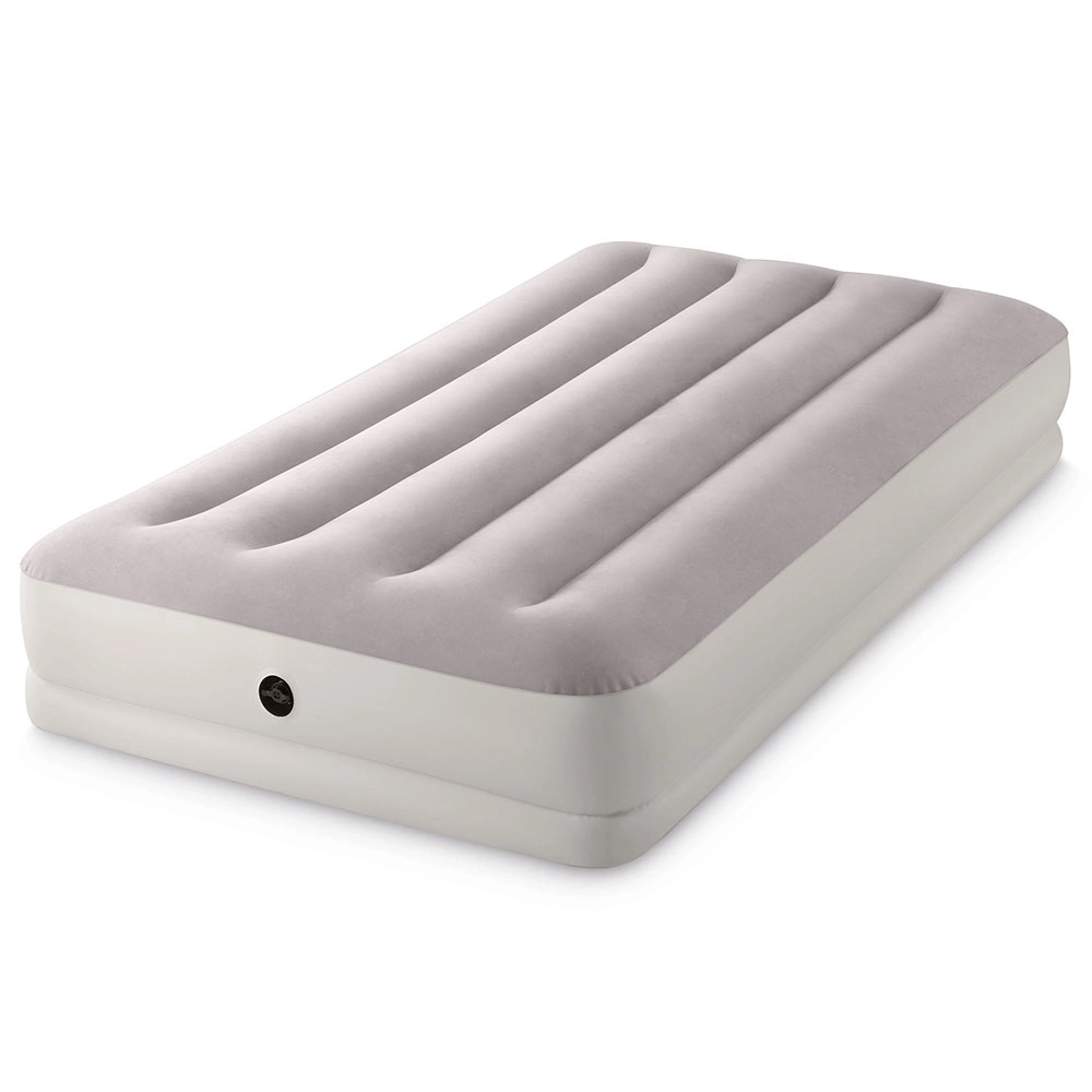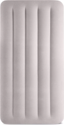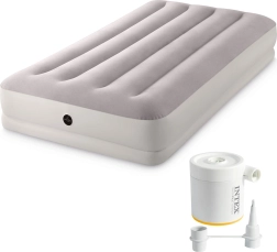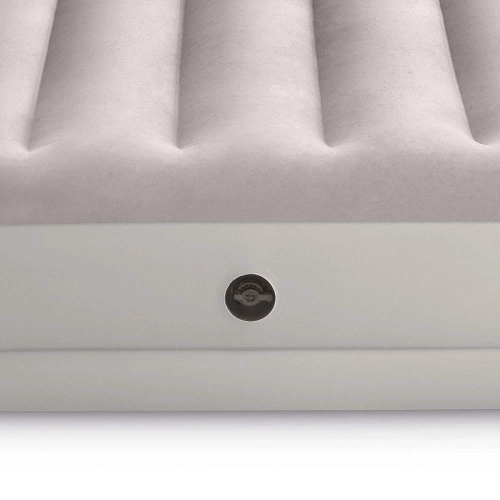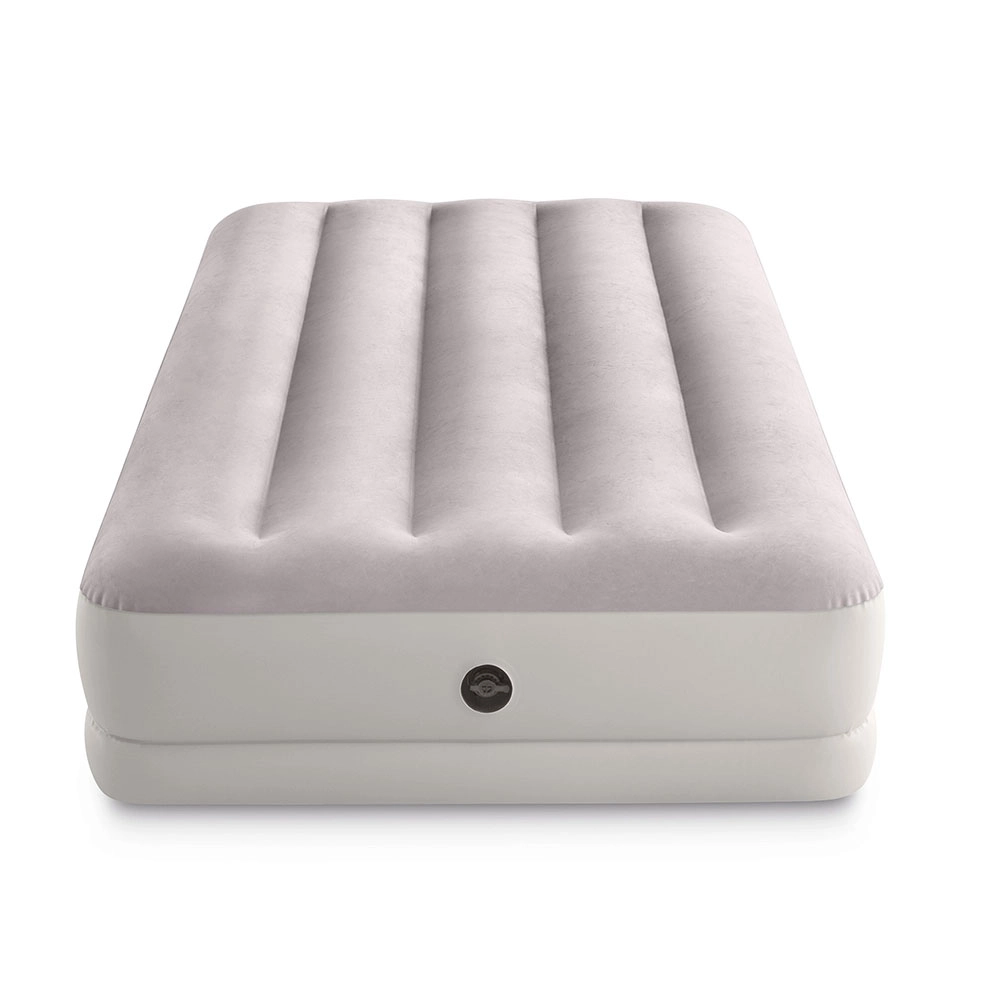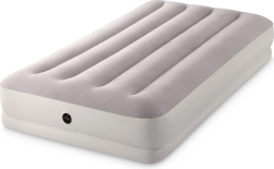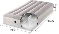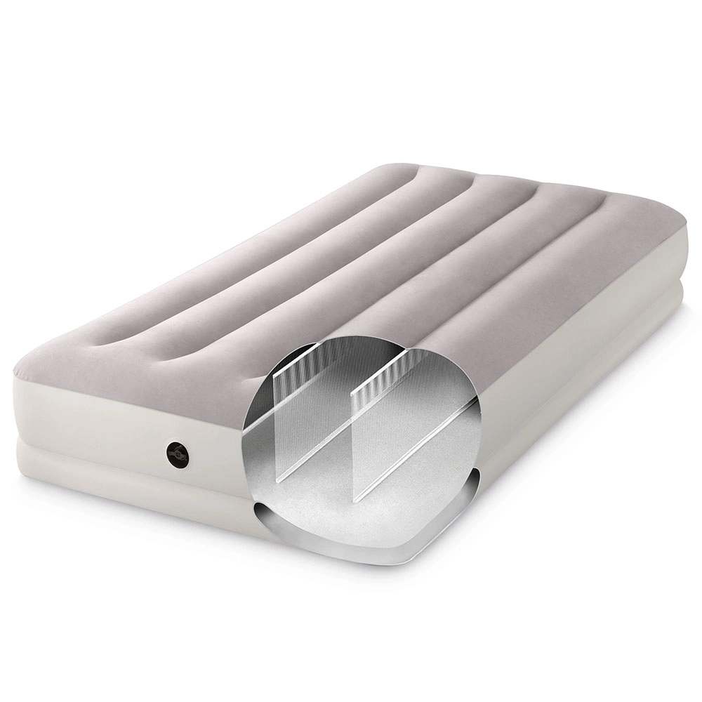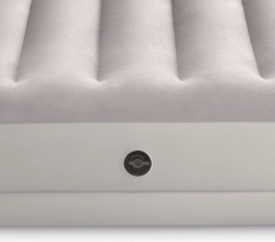 Patul gonflabil INTEX combină materialul PVC rezistent cu o suprafață flock catifelată, plăcută la atingere, care îmbunătățește confortul somnului. Construcția înălțată, cu camere longitudinale și armături interne, asigură stabilitate fără efect de balans și o susținere fiabilă a coloanei.