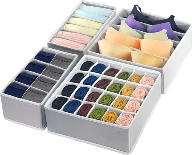 Set de 4 organizatoare pentru sertare. Inserțiile permit aranjarea ușoară, practică și economică a colecțiilor de cravate, șosete, curele și lenjerie intimă. Setul conține organizatoare de trei dimensiuni diferite, cu un număr diferit de compartimente și utilizări. Sunt fabricate din material durabil, care permite circulația aerului. Construcția deschisă asigură acces rapid la haine. Datorită posibilității de pliere, economisiți spațiu suplimentar atunci când nu folosiți niciuna dintre inserții.