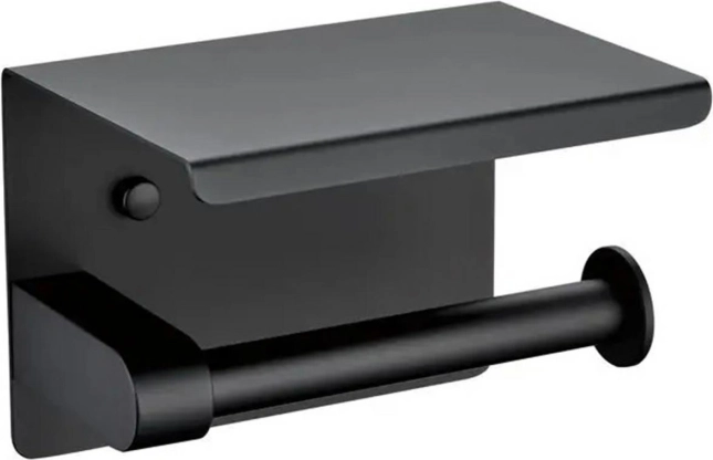 Suport negru elegant pentru hârtie igienică în stil loft, care adaugă practicitate datorită etajerei integrate pentru plasarea telefonului sau a altor mărunțișuri. Construcție robustă din oțel inoxidabil, vopsită electrostatic pentru rezistență la coroziune, asigurând utilizare de lungă durată.
