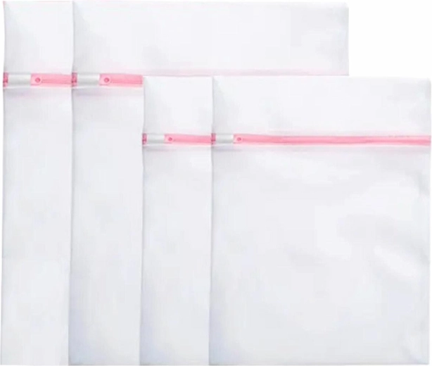 Setul conține patru saci de două dimensiuni diferite: doi saci au dimensiunile 30 cm x 40 cm și doi saci au dimensiunile 60 cm x 50 cm. Realizați din poliester de calitate în alb, acești saci sunt soluția ideală pentru protejarea rufelor delicate.