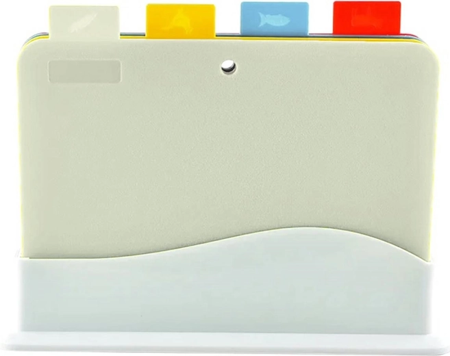 Set de patru tocătoare colorate, împreună cu suport dedicat. Codul pe culori facilitează alocarea lor pentru un anumit tip de aliment și previne transferul bacteriilor între ele. Fiecare tocător are, în plus, un pictogram care indică pentru ce este destinat.