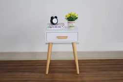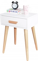 Linii curate, culoare albă și lemnul natural al picioarelor aduc încăperii prospețime și lejeritate. Ideală ca noptieră sau măsuță laterală.