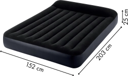 Salteaua catifelată INTEX, cu dimensiunile 203 x 152 x 25 cm, este ideală pentru 2 persoane. Fabricată din material PVC rezistent, partea superioară este acoperită cu un material catifelat impermeabil, plăcut la atingere. Întregul, în culoare bleu-marin plăcută, se potrivește în orice interior. Datorită pompei electrice încorporate (alimentare 220 - 240 V), timpul necesar pentru a pregăti patul gonflabil pentru utilizare este de 250 de secunde. Datorită valvei Boston, îl dezumfli în circa un minut, îl pliezi și îl depozitezi în dulap.
