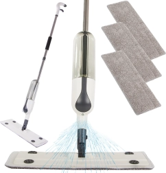 Mopul este livrat cu 3 lavete din microfibră, oferind confort datorită butonului de pulverizare integrat în mâner. Este potrivit pentru toate suprafețele și permite curățenia perfectă fără a necesita găleată.
