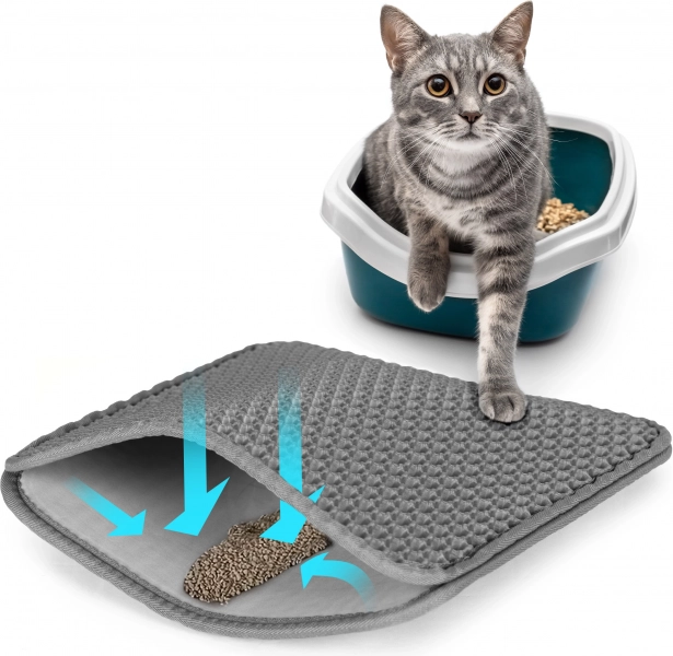 Covorașul practic cu două straturi pentru litiera pisicii, în eleganta culoare gri de la PETSI, menține zona toaletei curată. Datorită stratului superior cu structură tip plasă, granulele de nisip vărsate sunt captate, cad în interiorul covorașului și pot fi ușor golite. Covorașul este antiderapant, rezistent, sigur pentru pernuțele labelor și ușor de curățat.