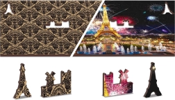 Asamblează motivul colorat al Parisului de noapte sau verso-ul cu model repetitiv doar după formele pieselor. Două provocări într-o singură cutie.
