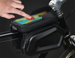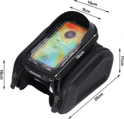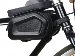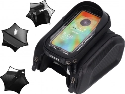 Curelele reglabile cu arici asigură prinderea fermă de cadru și demontarea ușoară. Buzunarul superior pentru telefon poate fi scos rapid.