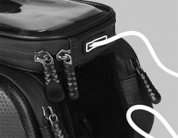 Fermoarele rezistente la apă și materialele durabile protejează împotriva ploii și murdăriei. Două compartimente laterale cu fermoar găzduiesc chei, portofel, unelte sau acte, iar buzunarul superior pentru telefon este detasabil pentru scoatere rapidă. Există și ieșire pentru cablu de căști sau powerbank.
