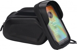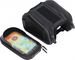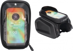 Această geantă compactă de cadru combină spațiul de depozitare pentru mărunțișuri cu o husă practică pentru telefon. Partea superioară transparentă, tactilă, permite controlul comod al hărților, muzicii sau apelurilor, în timp ce construcția rigidă tip carcasă îți protejează conținutul. Datorită curelelor reglabile cu arici, se fixează ușor și ferm pe cadrul majorității bicicletelor.
