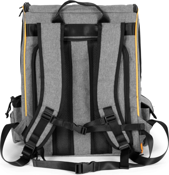 Pentru purtare confortabilă, are bretele de umăr late și căptușite, completate de chinga de piept și brâul lombar pentru stabilitate. În interior se află o saltea moale și o carabină de siguranță pentru lesă/zgardă. Buzunarele laterale găzduiesc lesa, recompensele sau pungile – unul dintre buzunare are un orificiu pentru extragerea ușoară a pungilor.