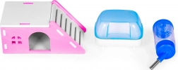 - căsuță, 2× tobogan, roată de alergat, 4 niveluri, bol, adăpătoare
