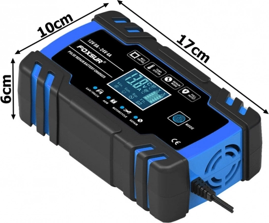 Încărcător compact și inteligent pentru baterii auto 12V/24V, cu afișaj digital și mod de reparație. Oferă încărcare rapidă și sigură, include mod de iarnă și de vară, protecție automată și restaurare prin impulsuri pentru revitalizarea acumulatoarelor slabe. Ideal pentru mașini, motociclete și alte baterii de vehicule.