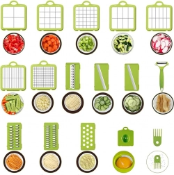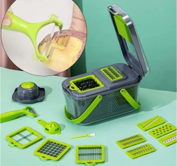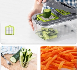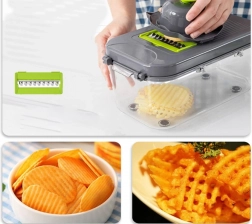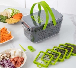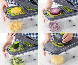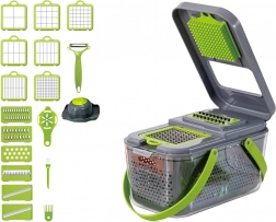 Acest tocător universal economisește timp și spațiu în bucătărie. Într-un singur set primești tot ce ai nevoie pentru tăiere rapidă și precisă a legumelor, fructelor, brânzeturilor și ouălor fierte. Datorită recipientului închis, totul cade direct în interior, blatul rămâne curat, iar porțiile sunt uniforme.