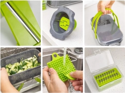De la felii la julienne, până la cuburi și răzuire – setul include grile, răzătoare și mandolină, plus suport de siguranță și perie de curățare.