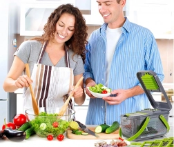 Presatorul cu grilă împinge ingredientele direct în recipientul transparent. Pregătești cuburi de castravete, ceapă sau cartofi în câteva secunde, iar bucătăria rămâne curată.