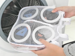 Plasa deasă și fermoarul protejează încălțămintea împotriva zgârierilor și loviturilor și, în același timp, previn deteriorarea tamburului mașinii de spălat.