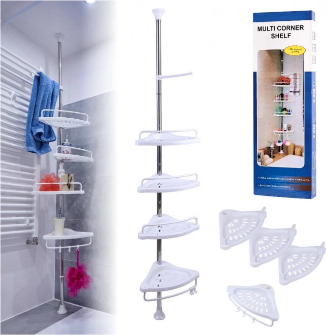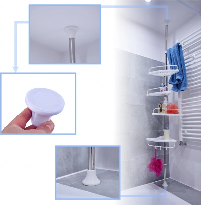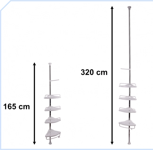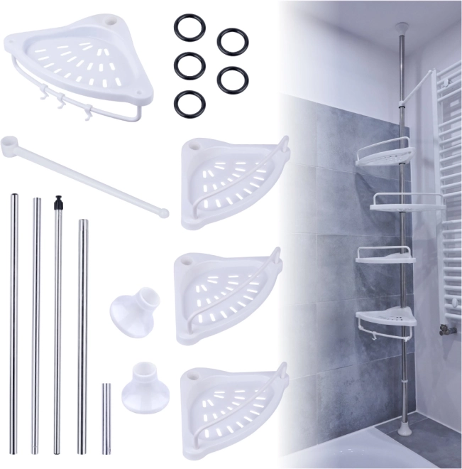 Raftul de colț pentru baie, pe care îl poți plasa sub duș fără a folosi unelte, este soluția perfectă. Este suficient să asamblezi și să așezi raftul în locul dorit. Construcția telescopică permite ajustarea perfectă a acestuia la baia ta!