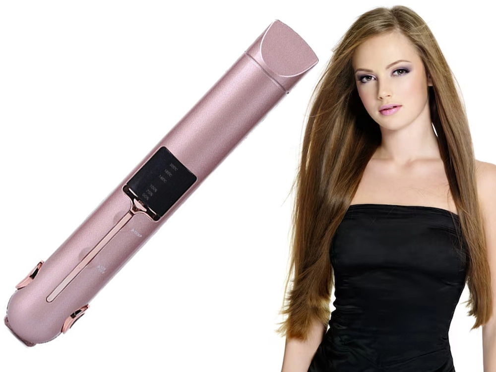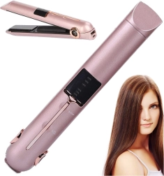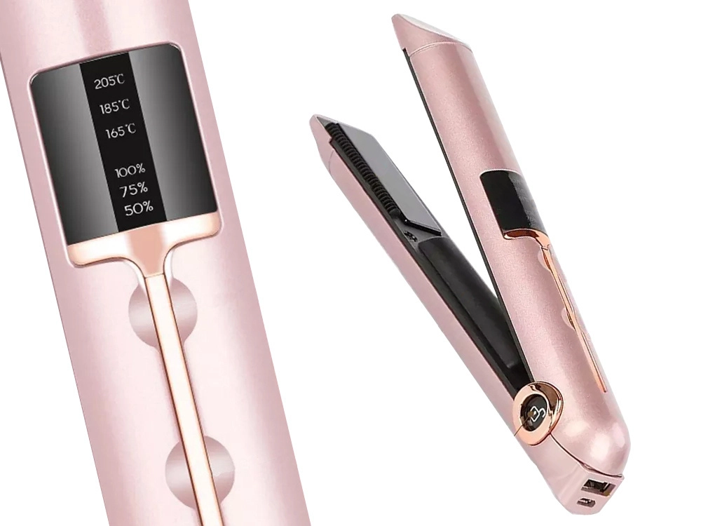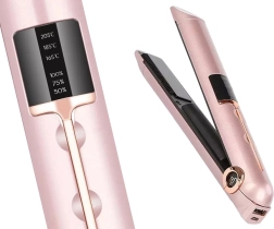 Placă de păr compactă fără fir, cu plăci ceramice și afișaj LCD, pentru coafare rapidă și delicată oriunde. Oferă 3 trepte de temperatură 165/185/205 °C, încălzire rapidă, styling universal 2‑în‑1 (îndreptare și onduleuri) și funcție practică de powerbank pentru încărcarea telefonului. Ideală pentru călătorii datorită încărcării USB‑C și dimensiunilor compacte.