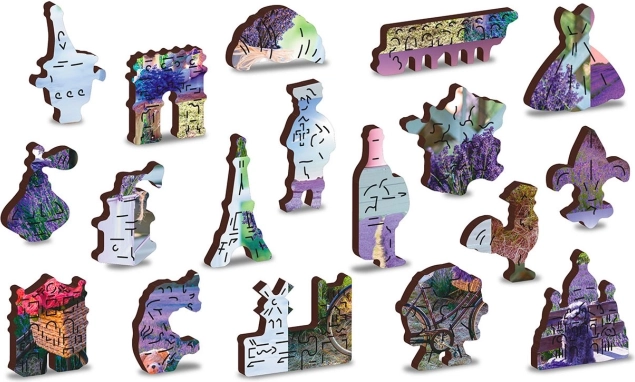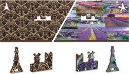 Răsfață‑te cu relaxare la un puzzle din lemn de calitate, cu motivul câmpurilor de lavandă. Execuția față-verso 2‑în‑1 îți permite să asamblezi atât după imaginea color, cât și după partea din spate cu model repetitiv – ideal pentru cei care iubesc provocările bine gândite și finisajele precise.