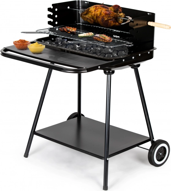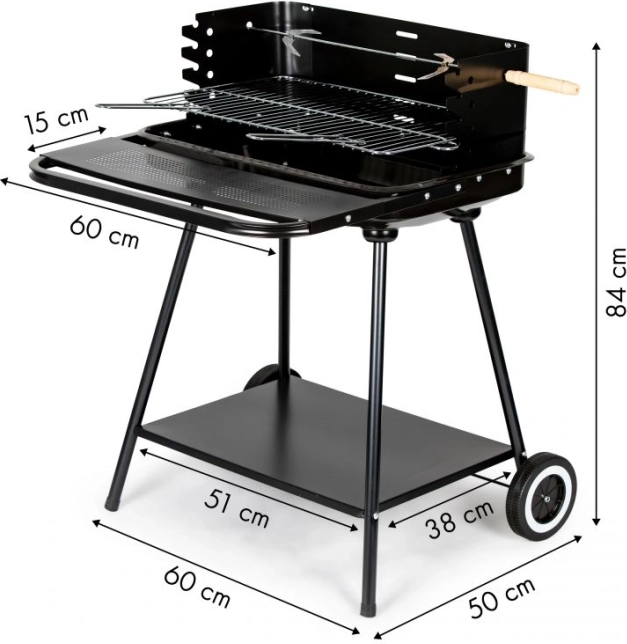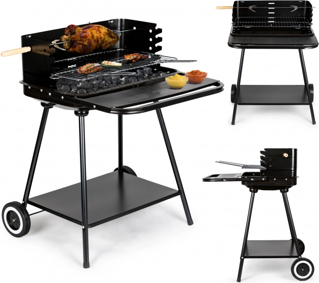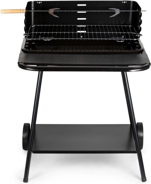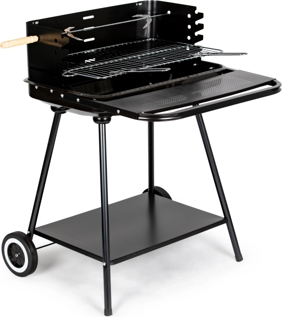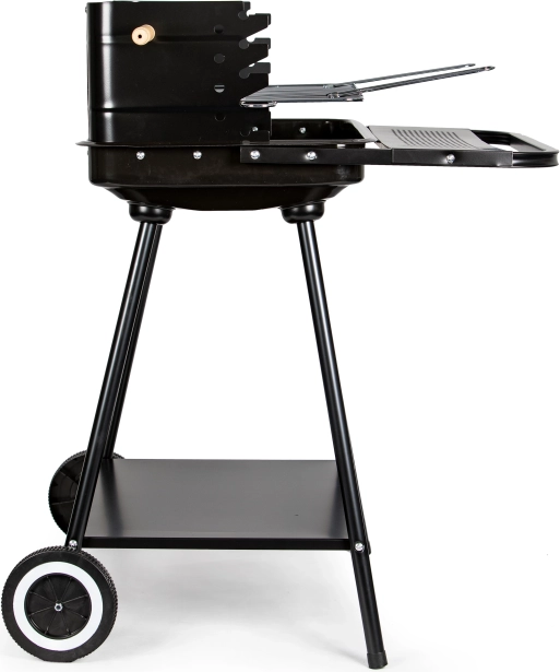 Acest grătar este echipat cu roți și mâner, care facilitează deplasarea chiar și atunci când este complet încălzit. Raftul inferior oferă spațiu pentru depozitarea cărbunelui sau altor necesități pentru grătar.