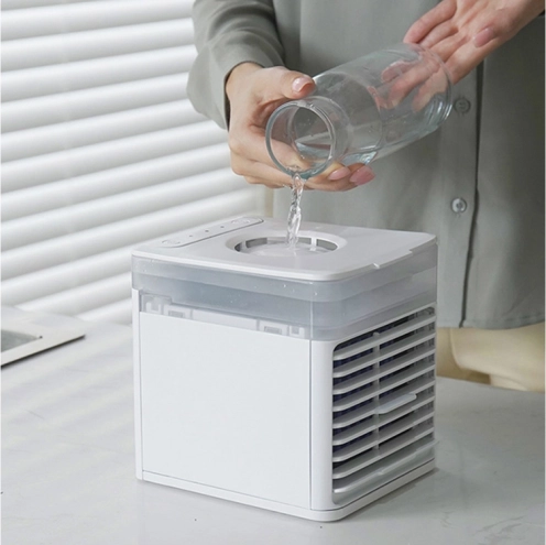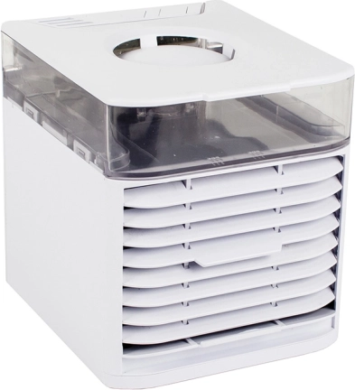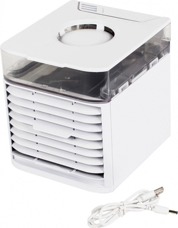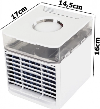 Mini aer condiționat portabil perfect pentru zilele fierbinți, acasă sau la birou. Acest dispozitiv mic poate reduce semnificativ temperatura din camera și este ușor de plasat pe birou sau dulap datorită dimensiunilor sale compacte. Este echipat cu iluminare LED colorată care variază în nuanțe.
