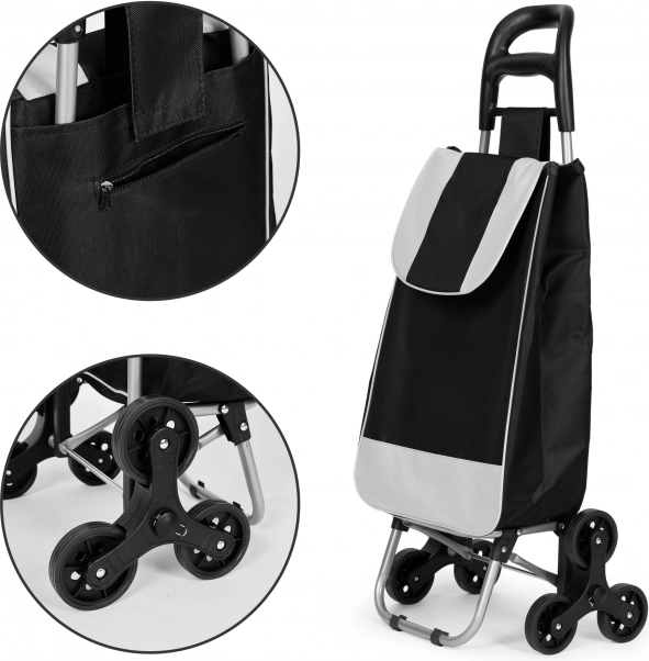 Căruciorul este dotat cu roți triple din cauciuc pentru a face mai ușoară depășirea obstacolelor precum bordurile sau scările, facilitând transportul ușor al cumpărăturilor tale cu efort minim.