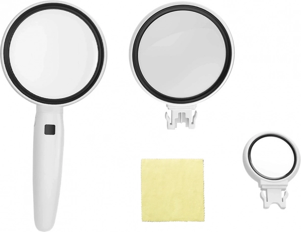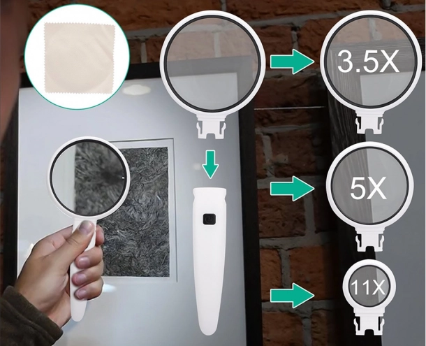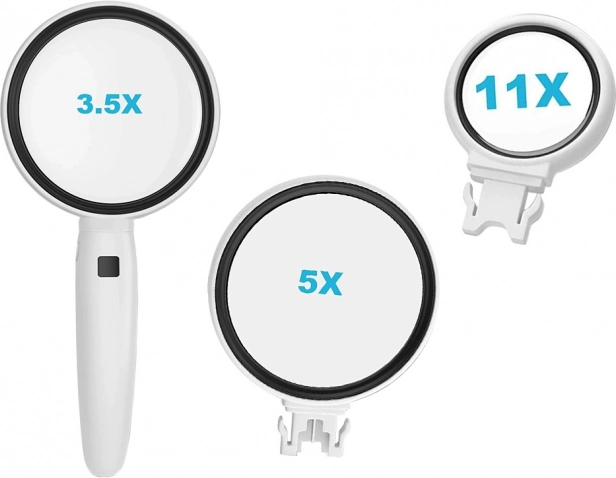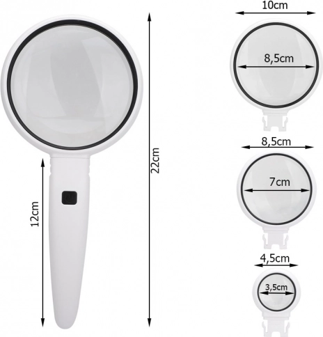 Lupă de mână practică, cu mâner ergonomic și 2x iluminare LED pentru o vizualizare clară și confortabilă a detaliilor. Pachetul include 3 lentile interschimbabile cu mărire 3,5x, 5x și 11x, ideale pentru citit, numismatică, bijuterii și lucrări de precizie acasă. Alimentarea este asigurată de 3× LR44 baterii (incluse).