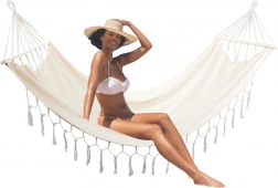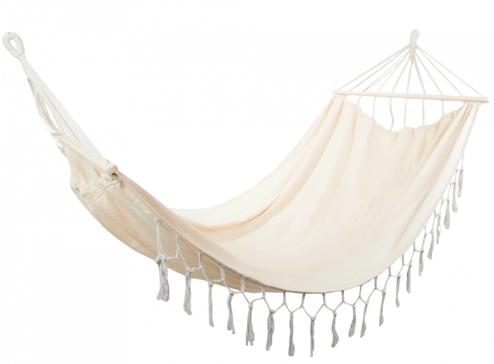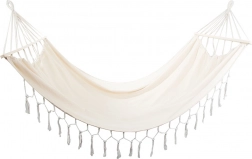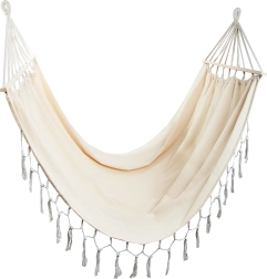 Acest hamac boho este ideal pentru cupluri sau pentru cei care iubesc confortul și stilul. Suprafața largă de întins, cu bare din lemn, menține țesătura bine întinsă, astfel încât te poți așeza comod și te poți bucura de liniște în grădină, pe balcon sau în vacanță.