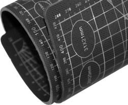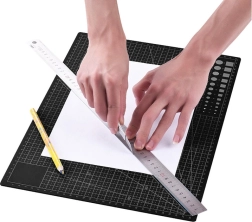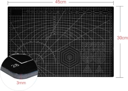 Covoraș profesional de tăiere A3 pentru modelism, croitorie și ateliere creative. Datorită construcției multistrat din material special, după tăiere se închide parțial și suprafața rămâne netedă. Tipărire pe ambele fețe cu grilă în centimetri, unghiuri și repere care asigură precizie maximă și protecția mesei de lucru.