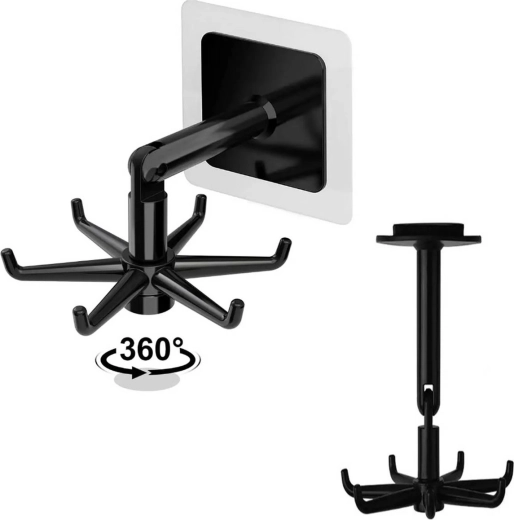 Cârlig de bucătărie autocolant cu șase cârlige pe un suport rotativ. Montare ușoară și neinvazivă datorită benzii adezive care permite instalarea cârligului atât sub dulap, cât și pe perete.