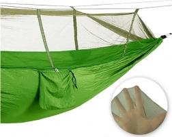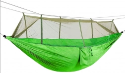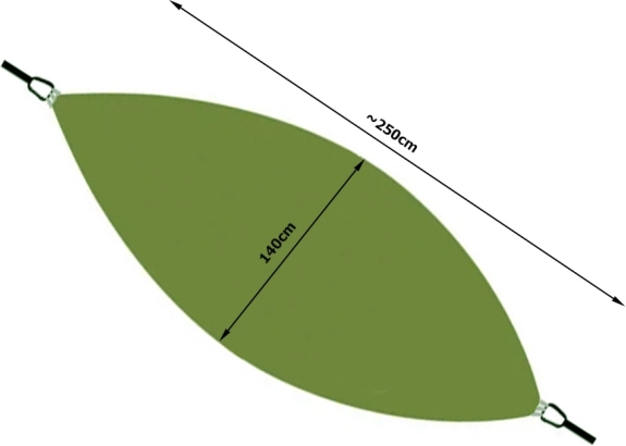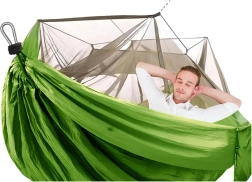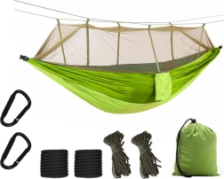 Pachetul include tot ce aveți nevoie pentru o instalare rapidă – carabiniere rezistente, corzi durabile pentru prinderea de copaci și pentru susținerea plasei antițânțari. Buzunarul integrat este util pentru mărunțișuri și servește și ca husă pentru o împachetare facilă. Cu o capacitate de încărcare de până la 150 kg și dimensiuni de 250 × 140 cm, oferă confort pentru una până la două persoane.