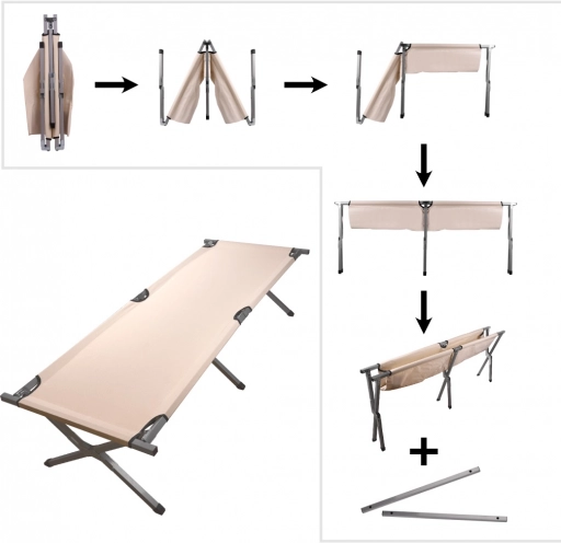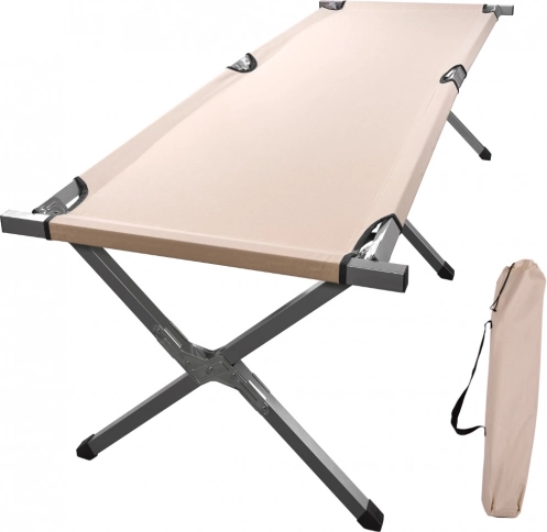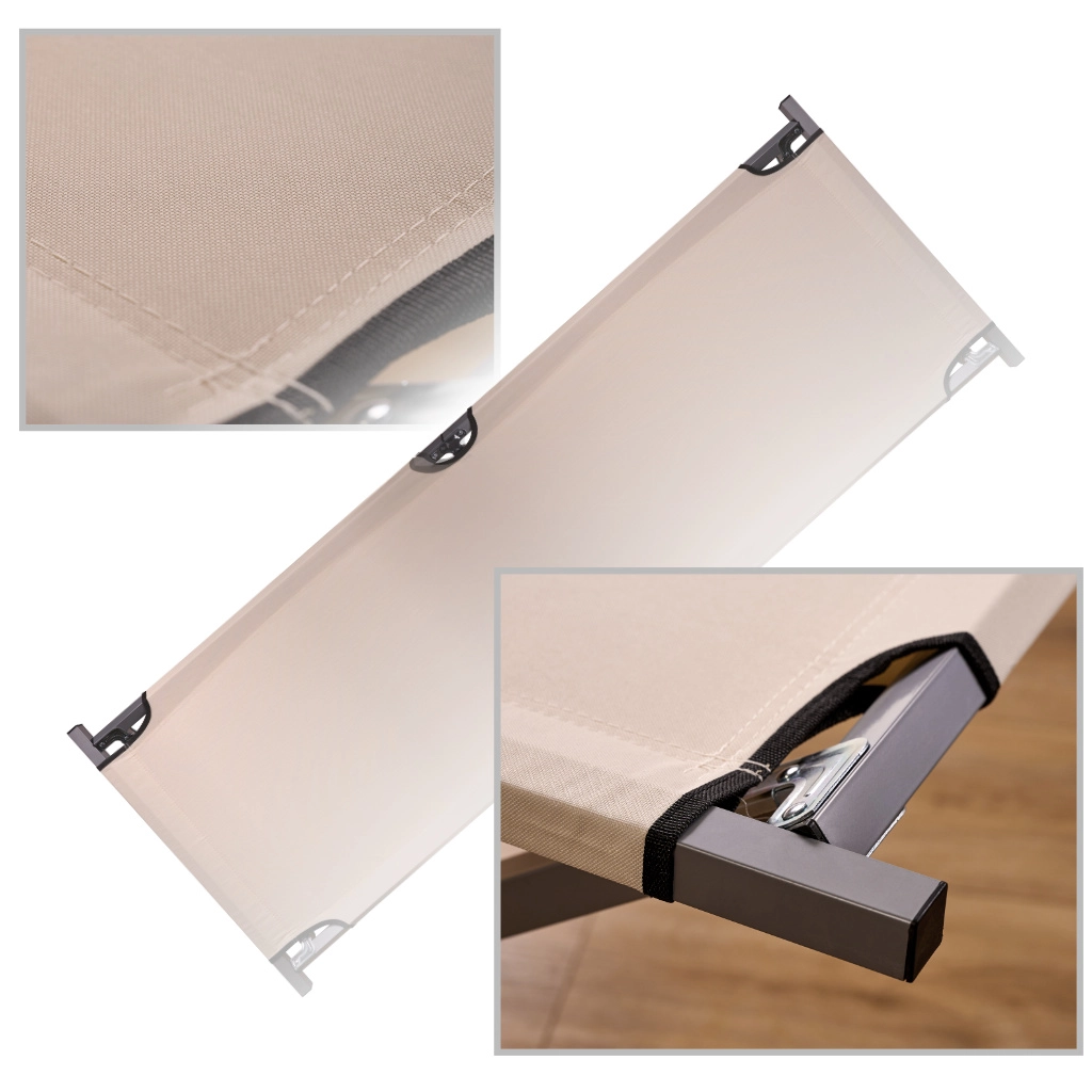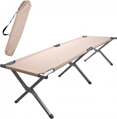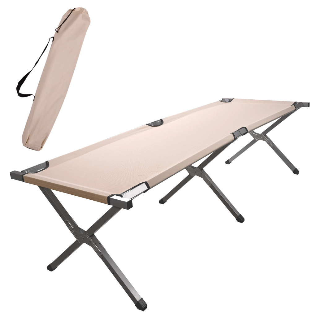 Acest pat pliabil tip campanie, mărime XXL, oferă o suprafață stabilă și plană pentru odihnă de calitate în camping, în grădină sau acasă pentru oaspeți. Cadrul din oțel întărit, cu sprijin tripunct în cruce, garantează stabilitate ridicată, iar țesătura rezistentă din poliester 600D se curăță ușor și este pregătită pentru condițiile de exterior.