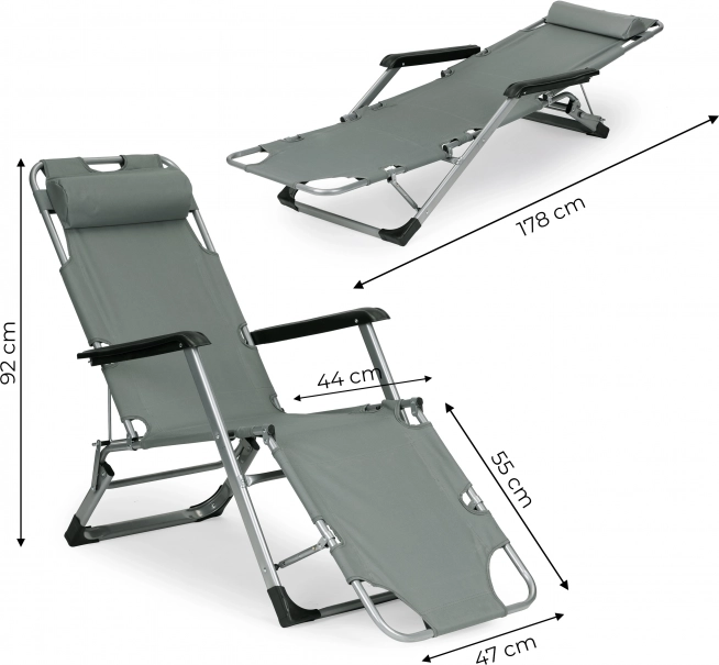 Șezlongul poate fi pliat într-un scaun, iar datorită designului său inteligent este nevoie de doar un moment pentru a-l transforma într-un șezlong confortabil, ideal pentru relaxare în aer liber.