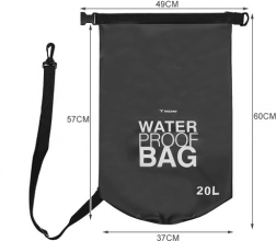 Sacul este fabricat din PVC rezistent cu adaos de poliester și PP, care asigură rezistență, protecție la abraziune și curățare facilă. Datorită curelei de umăr reglabile (55–105 cm) se poartă confortabil și poate fi prins, de asemenea, de un bagaj mai mare sau de barcă.