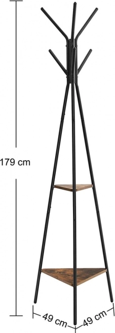 Cuier vertical stilat, în design loft, cu combinație de metal și lemn, potrivit pentru hol, dressing, living și coridor. Oferă 6 cârlige rotunjite pentru paltoane și accesorii, 2 rafturi practice și o bază stabilă cu trepied. Structura din fier solid și MDF durabil asigură o durată lungă de viață, în timp ce picioarele de siguranță protejează podeaua.