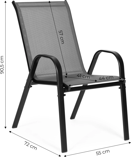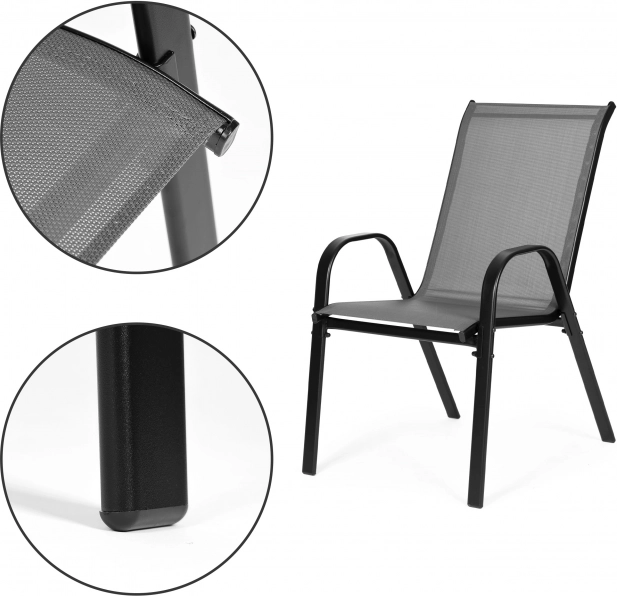Șezutul și spătarul din plasă textilă se adaptează formei corpului, oferind un confort ridicat la ședere și fiind ideale pentru utilizarea în aer liber.