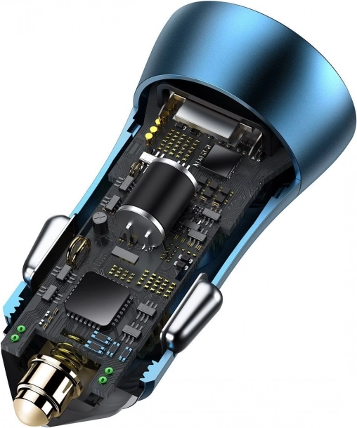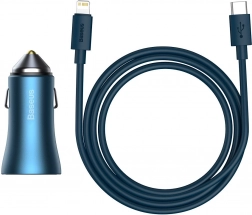 Carcasa metalică durabilă din aluminiu cu elemente ABS/PC disipă bine căldura, stă ferm în priza brichetei de 12–24 V, iar LED‑ul albastru facilitează conectarea după lăsarea serii. În pachet se găsește cablu USB‑C – Lightning (1 m), astfel că dispozitivele APPLE se conectează fără a mai cumpăra accesorii suplimentare.