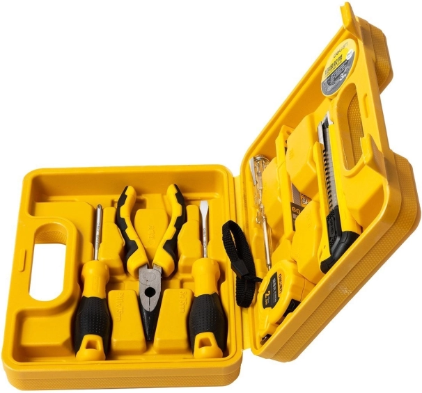 Setul include: cuțit cu lungime reglabilă a lamei, 10 lame de rezervă, bandă izolantă rezistentă de 3m și ruletă de măsurat de 2m. De asemenea, conține 2 șurubelnițe cu mâner antiderapant, clește din oțel inoxidabil și tester de tensiune rezistent la coroziune pentru intervalul 100-500 V.