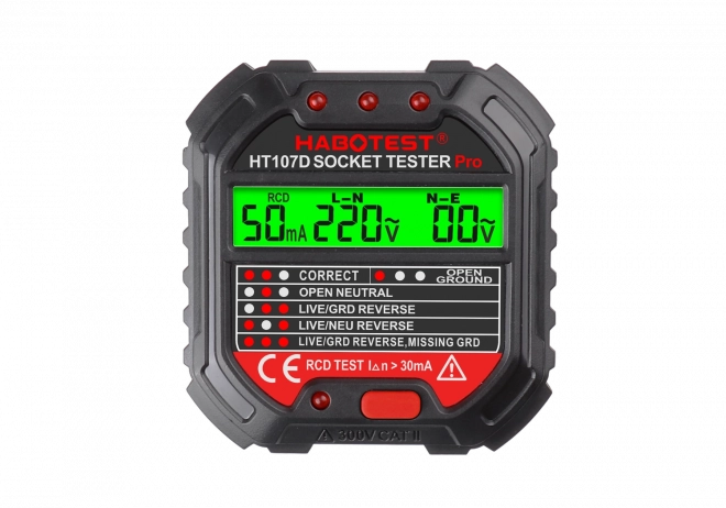 Asigurați-vă siguranța și o imagine clară asupra stării prizelor electrice. Testerul HABOTEST HT107D oferă un ecran LCD cu iluminare de fundal, care afișează tensiunea actuală și rezultatul testului de conexiune. Indicatorii LED din partea superioară semnalizează clar conexiunea corectă, lipsa conductorului de protecție, întreruperea nulului sau alte erori. Printr-o singură apăsare de buton realizați și testul funcțional RCD.