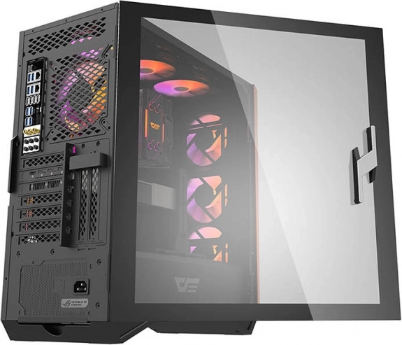 Panoul de sticlă rabatabil evidențiază elegant componentele și iluminarea RGB. Mânerul practic facilitează accesul rapid la hardware și întreținere.