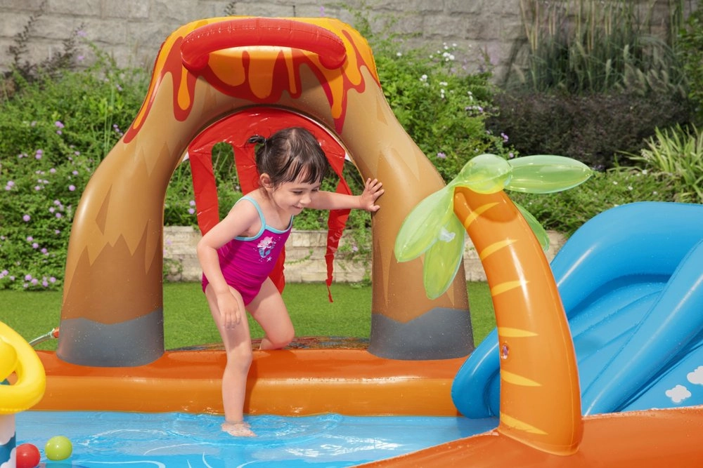 Terenul de joacă acvatic gonflabil Bestway Vulcan transformă grădina într-un centru al distracției estivale. Copiii se vor bucura de alunecarea pe tobogana gonflabilă moale, stropitul sub dușul de apă și joaca cu bile și elemente de aruncare. Datorită bazinului puțin adânc, centrul este potrivit pentru cei mai mici, în timp ce PVC-ul rezistent și valva de golire facilitează utilizarea și întreținerea.