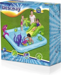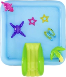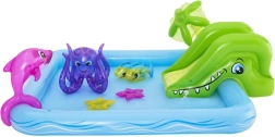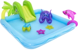 Transformați zilele de vară într-o aventură. Acest teren de joacă acvatic colorat, cu motive marine, îi încântă pe copiii de la 2 ani – îi așteaptă un tobogan către piscină, o fântână stropitoare în formă de copăcel după conectarea furtunului de grădină și un set de animăluțe gonflabile care stimulează imaginația și mișcarea.