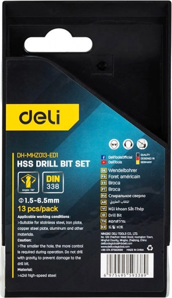 Set de 13 burghie HSS 4241 de la DELI TOOLS pentru găurire precisă și curată în oțel inoxidabil, oțel, aluminiu și cupru. Rezistență ridicată la uzură și la temperatură, dimensiuni precise și interval universal de 1,5–6,5 mm pentru utilizare largă.