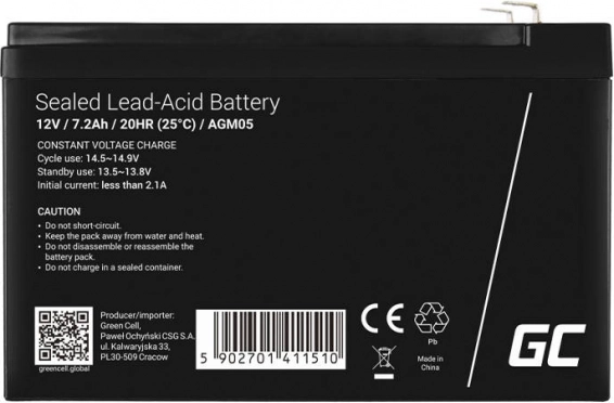 Acumulator AGM reîncărcabil 12 V / 7,2 Ah fiabil de la GREEN CELL pentru UPS, alarme, sisteme de securitate și alimentare de rezervă. Oferă funcționare fără întreținere, siguranță ridicată datorită tehnologiei VRLA/AGM și durată de viață lungă de până la 5+ ani. Ideal pentru utilizare ciclică și în regim de menținere.