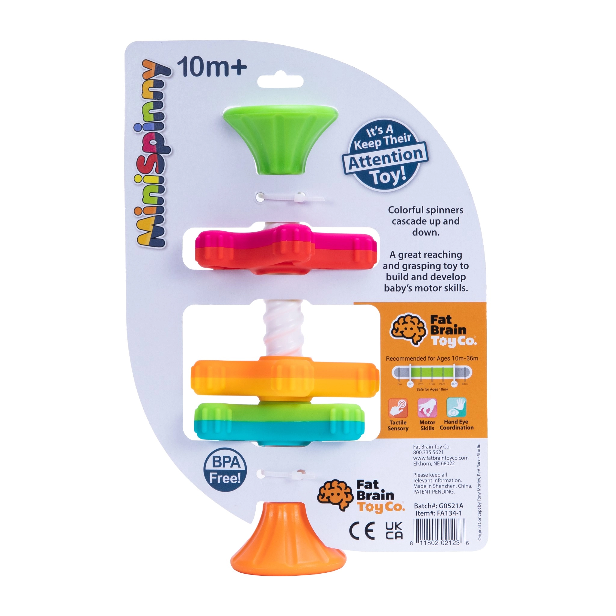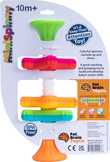 MiniSpinny este o jucărie senzorială ingenioasă care captivează copiii prin mișcare, culori și atingere. Trei discuri, cu un număr diferit de „piciorușe”, se rotesc lin pe axul spiral și creează un efect vizual fascinant în timpul coborârii. Suprafețele texturate invită la explorare și dezvoltă natural simțul tactil și coordonarea.