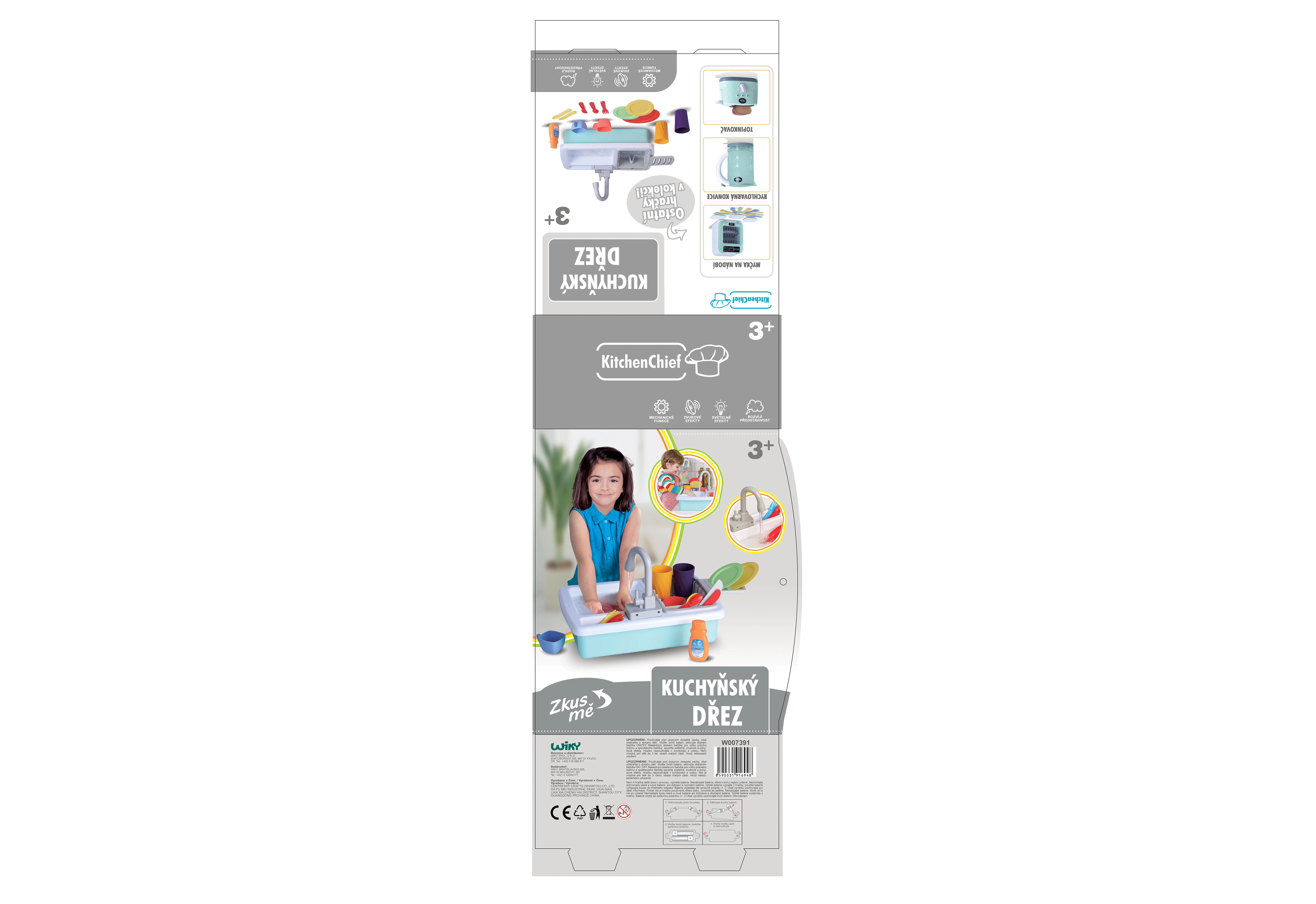 Pachetul include accesorii practice de bucătărie pentru a începe joaca imediat: căni, farfurii, ceșcuțe, tacâmuri și chiar detergent de vase pentru o joacă și mai realistă. Chiuveta este un accesoriu grozav pentru orice bucătărie de jucărie și asigură ore întregi de distracție.
