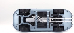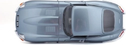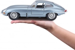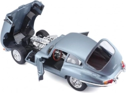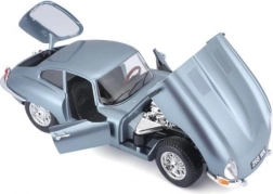 Model auto metalic la scară 1:18 Bburago 18-12044 Jaguar E-type Coupe, nu doar pentru colecționari. Are uși și capotă funcționale, iar virarea roților cu volanul este pe deplin funcțională. Culoarea modelului este argintiu-albastru metalizat.