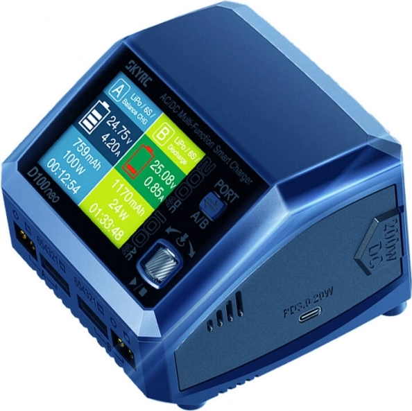 Încărcătorul dual compact SKYRC D100neo oferă încărcare simultană pe 2 porturi cu putere de până la 200 W DC (AC până la 100 W), curent de până la 10 A pe canal și un echilibrare precisă ±0,02 V. Suportă o gamă largă de acumulatori (LiPo, LiFe, Li-ion, LiHV, NiMH, NiCd, Pb), are un ecran color de 2,8", USB‑C Power Delivery 20 W pentru încărcarea rapidă a dispozitivelor și funcții avansate de siguranță pentru operare fiabilă.