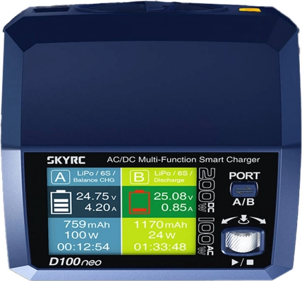 SKYRC D100neo îmbină performanța ridicată cu dimensiuni compacte. Fiecare canal suportă curent de până la 10 A, iar la alimentare în curent continuu încărcătorul oferă până la 200 W (2 × 100 W). La alimentare în curent alternativ, distribuie inteligent până la 100 W între ambele porturi. Echilibrarea precisă ±0,02 V asigură încărcarea uniformă a celulelor și o durată de viață mai lungă a bateriilor.